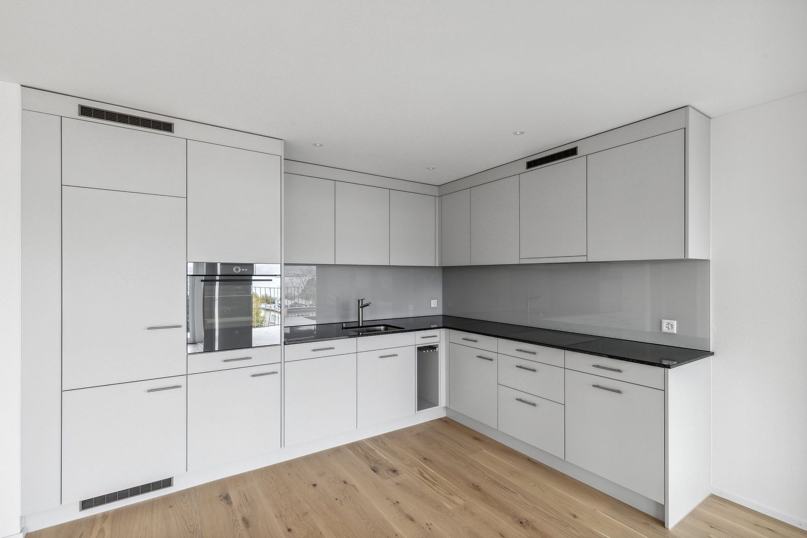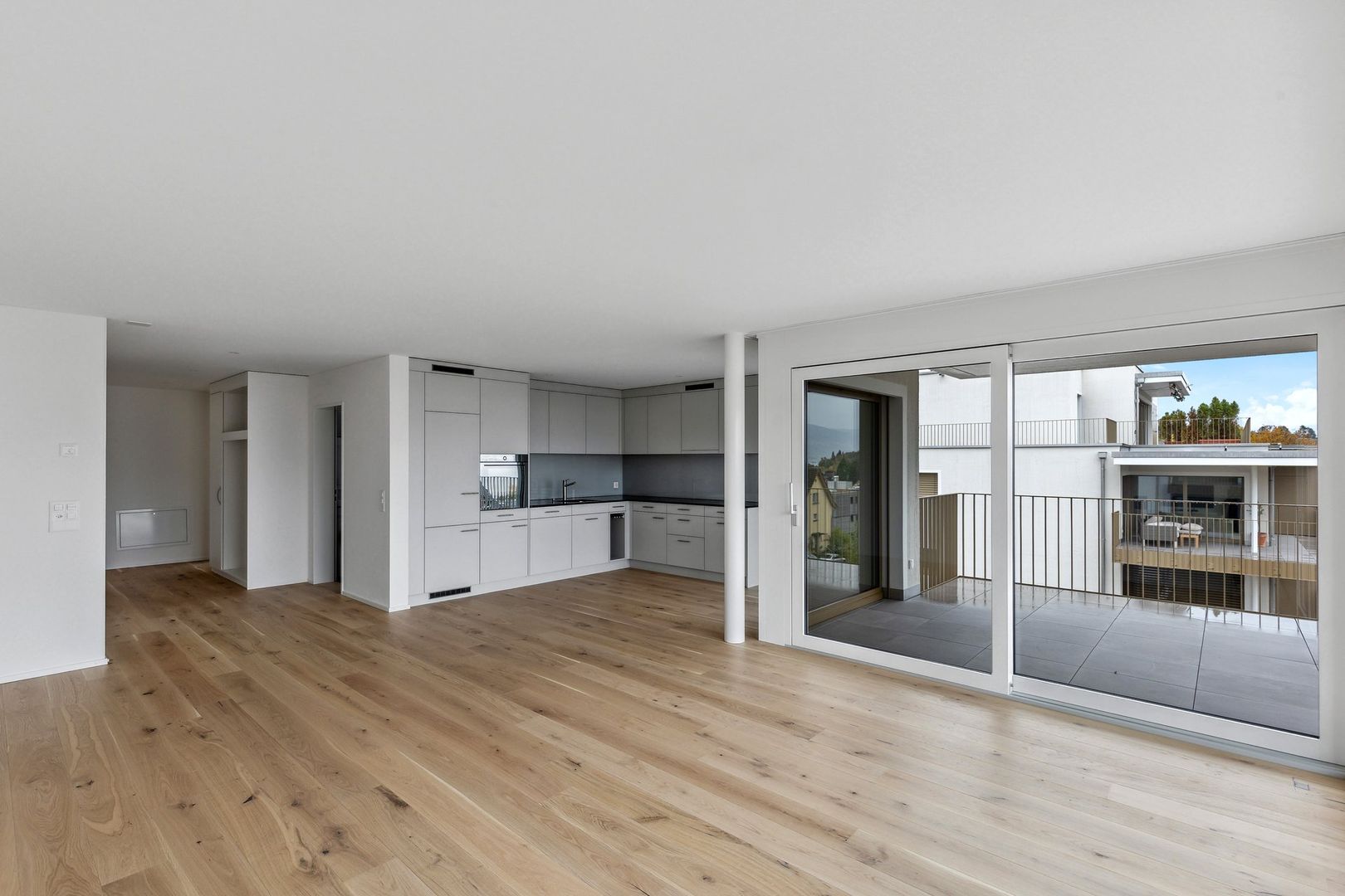Der grosszügige Wohn-/Essbereich mit offener Küche bildet das Herzstück der Wohnung und bietet direkten Zugang zum grossen Balkon, welcher zum Entspannen und Geniessen der Aussicht einlädt. Die Küche ist modern ausgestattet mit hochwertigen Geräten (V-ZUG), Natursteinabdeckung sowie viel Stauraum.