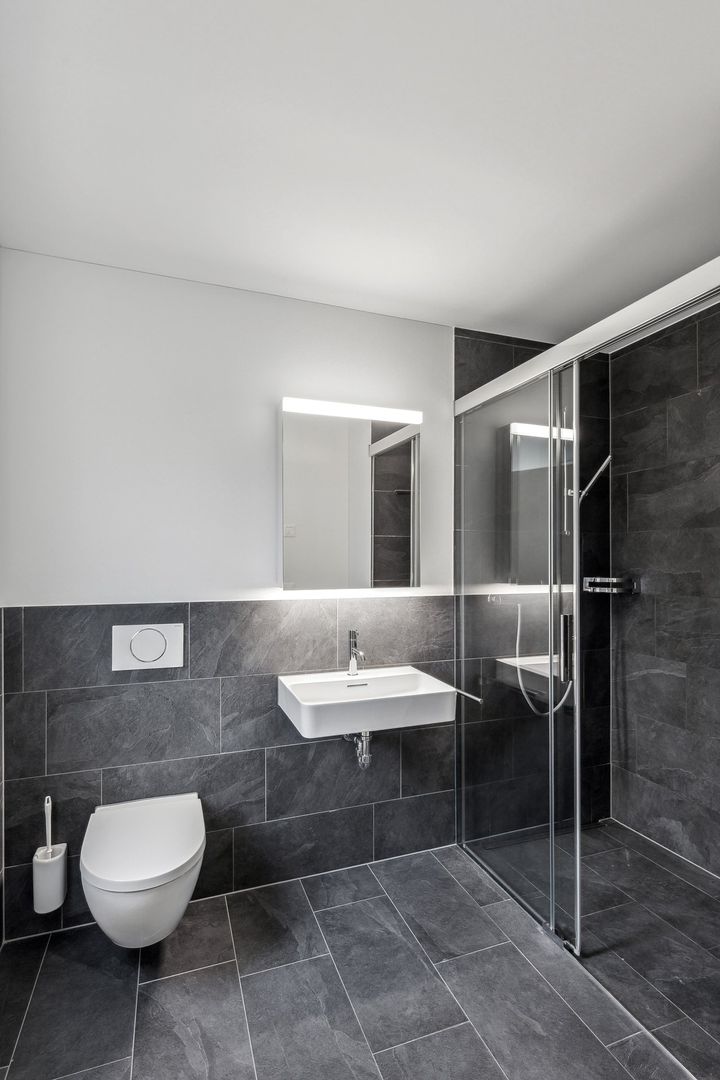 Zwei gut geschnittene Zimmer bieten vielfältige Nutzungsmöglichkeiten als Schlaf-, Arbeits- oder Gästezimmer. Die Wohnung verfügt über zwei Nasszellen (Bad/WC und Dusche/WC), ausgestattet mit Feinsteinzeugplatten, Echtglas-Duschtrennwänden sowie eigenem Waschturm.