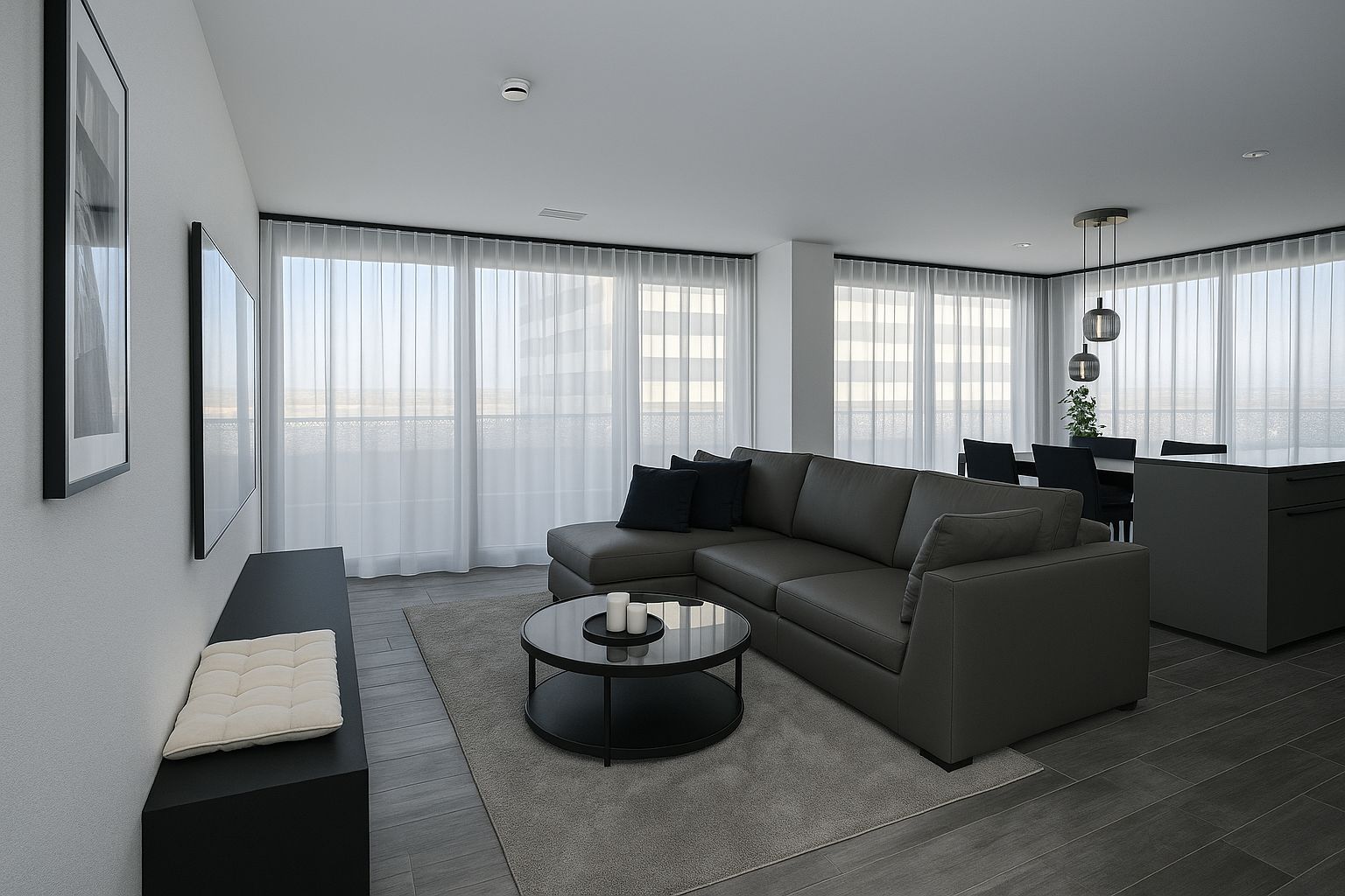 - Bodenplatten in der gesamten Wohnung: Grau, matt